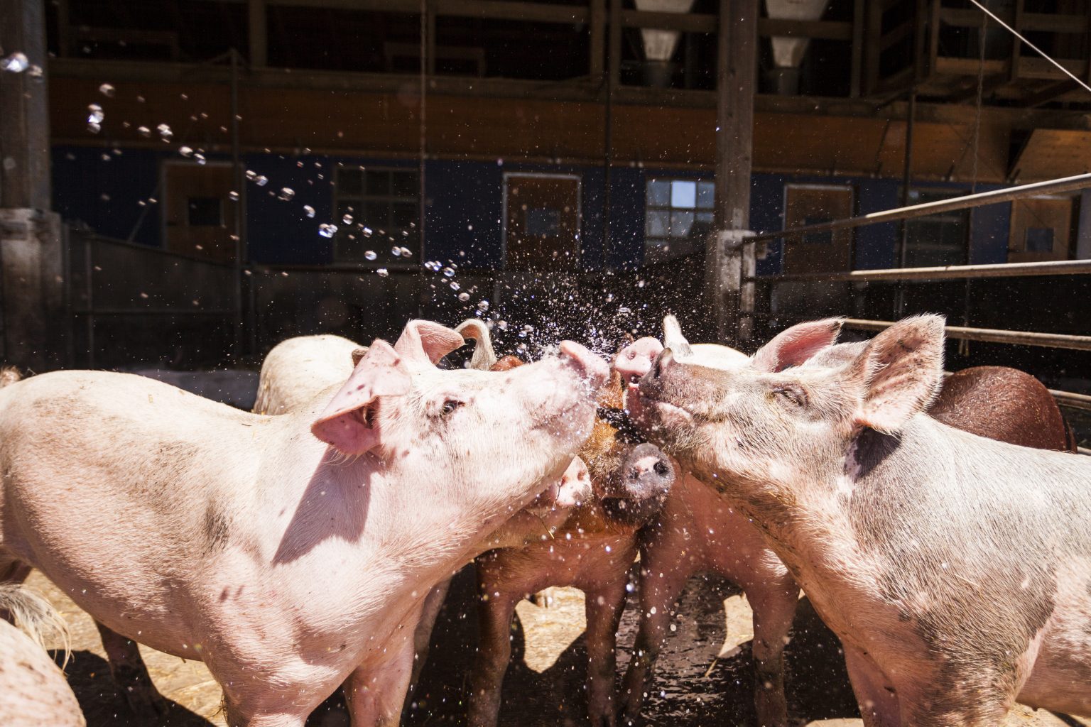 Der Schweinestall besteht aus drei Teilen: dem Zuchtstall, dem Getreidelager mit Mahl- und Mischanlage und dem Maststall. Es sind Offenfrontställe mit isoliertem Warmbereich, Stroheinstreu und Auslauf.